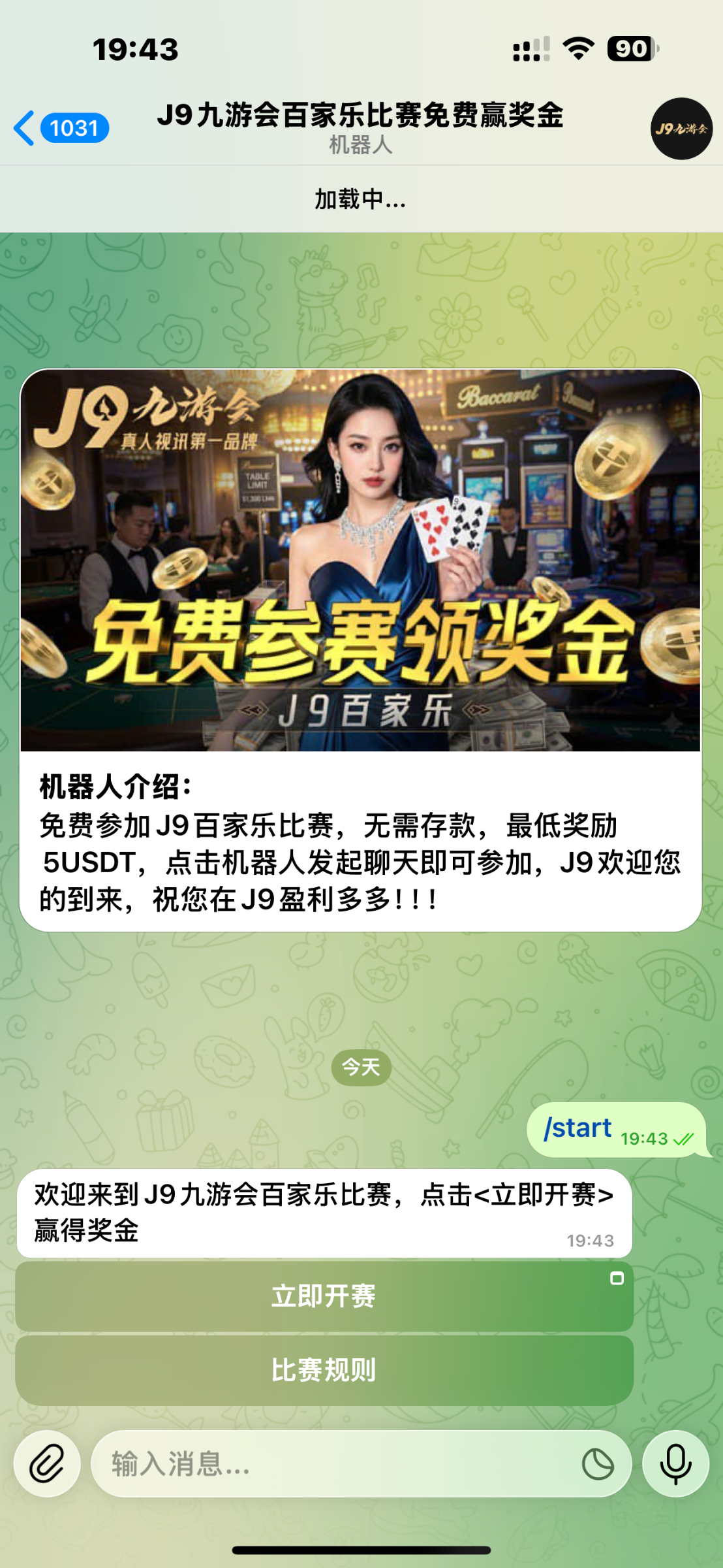 J9九游会百家乐参赛流程:点击机器人发起聊天<立即参赛>进入应用后点击<任务><签到领取门票>获得门票后即可参赛,每人100万筹码,10局比赛赢得5局且赢得5万筹码即可获得奖金5U 【每日签到皆可获得门票】