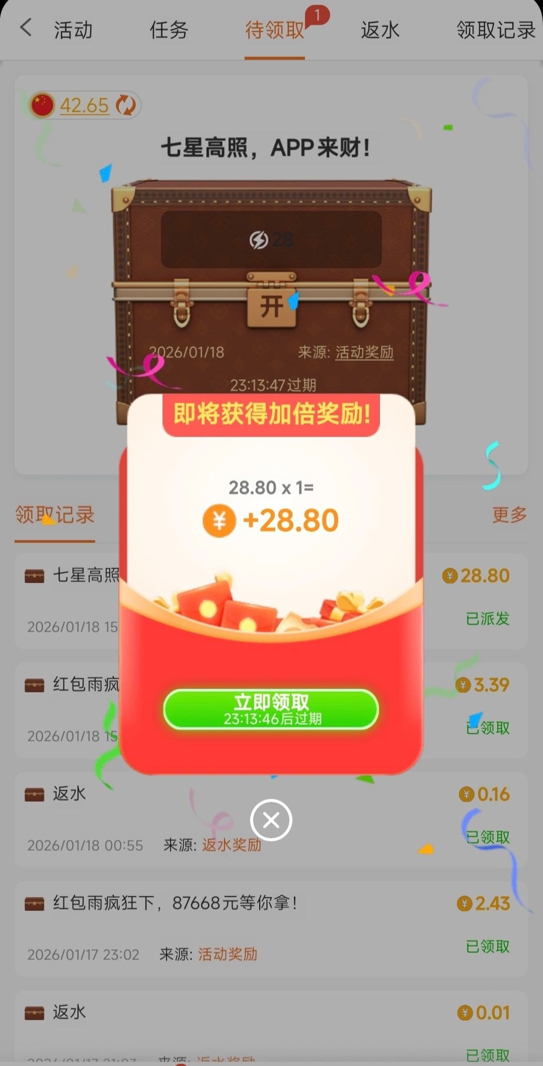 近期有充值过的可以看看,有的话下载APP才可以领,超级加倍,充1块都可以领了,我领到2个28.8